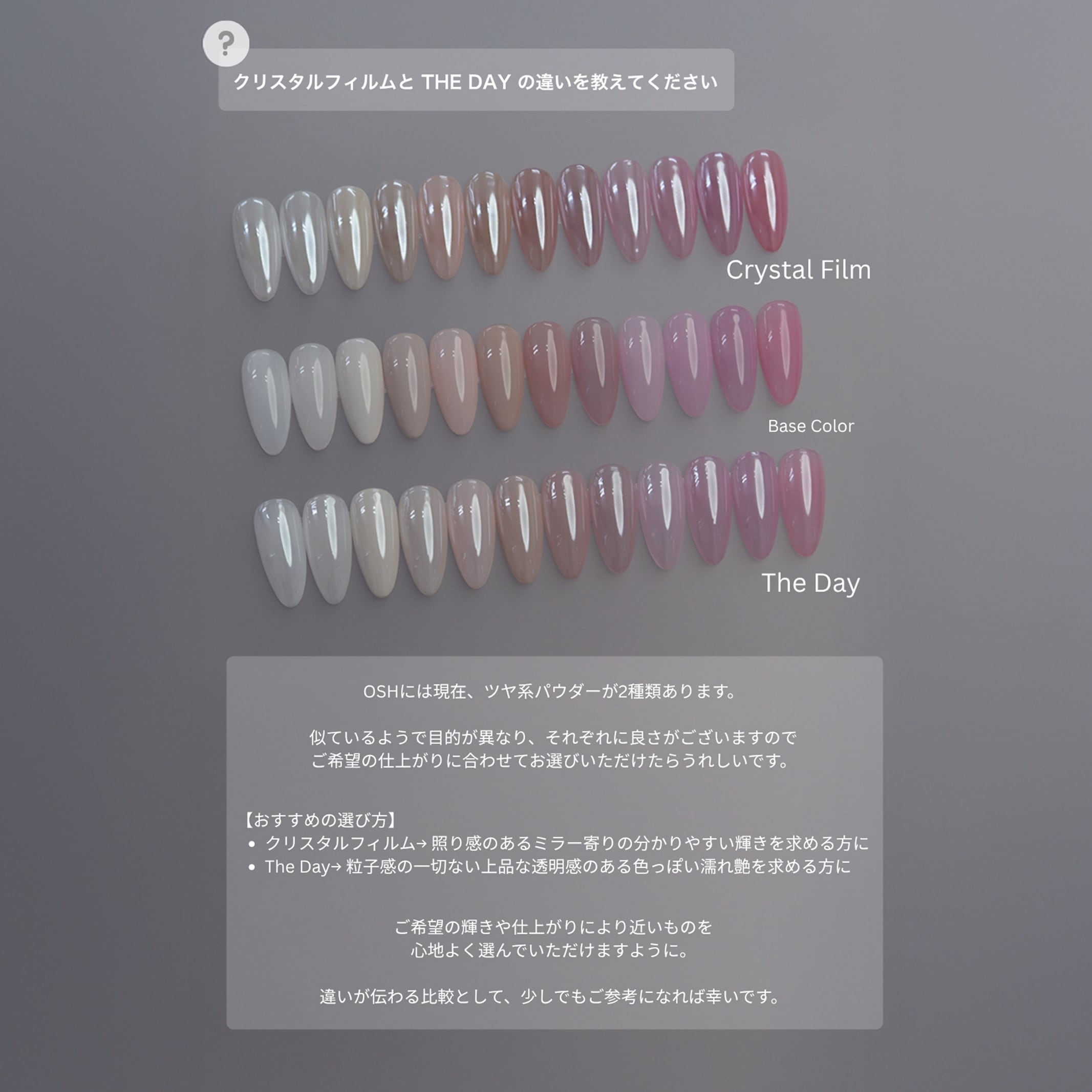 【The Day】は、パウダー塗布後はミラーのような輝きが残りますが、トップコートを重ねることでうるっとした上品な艶感に変化いたします。