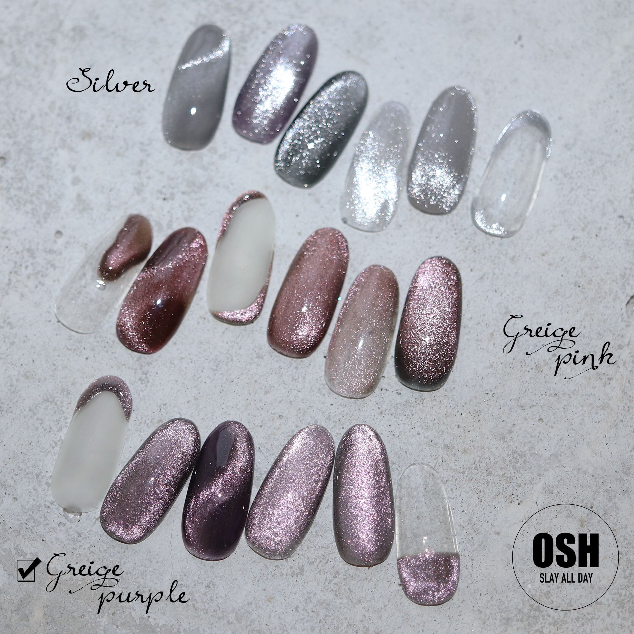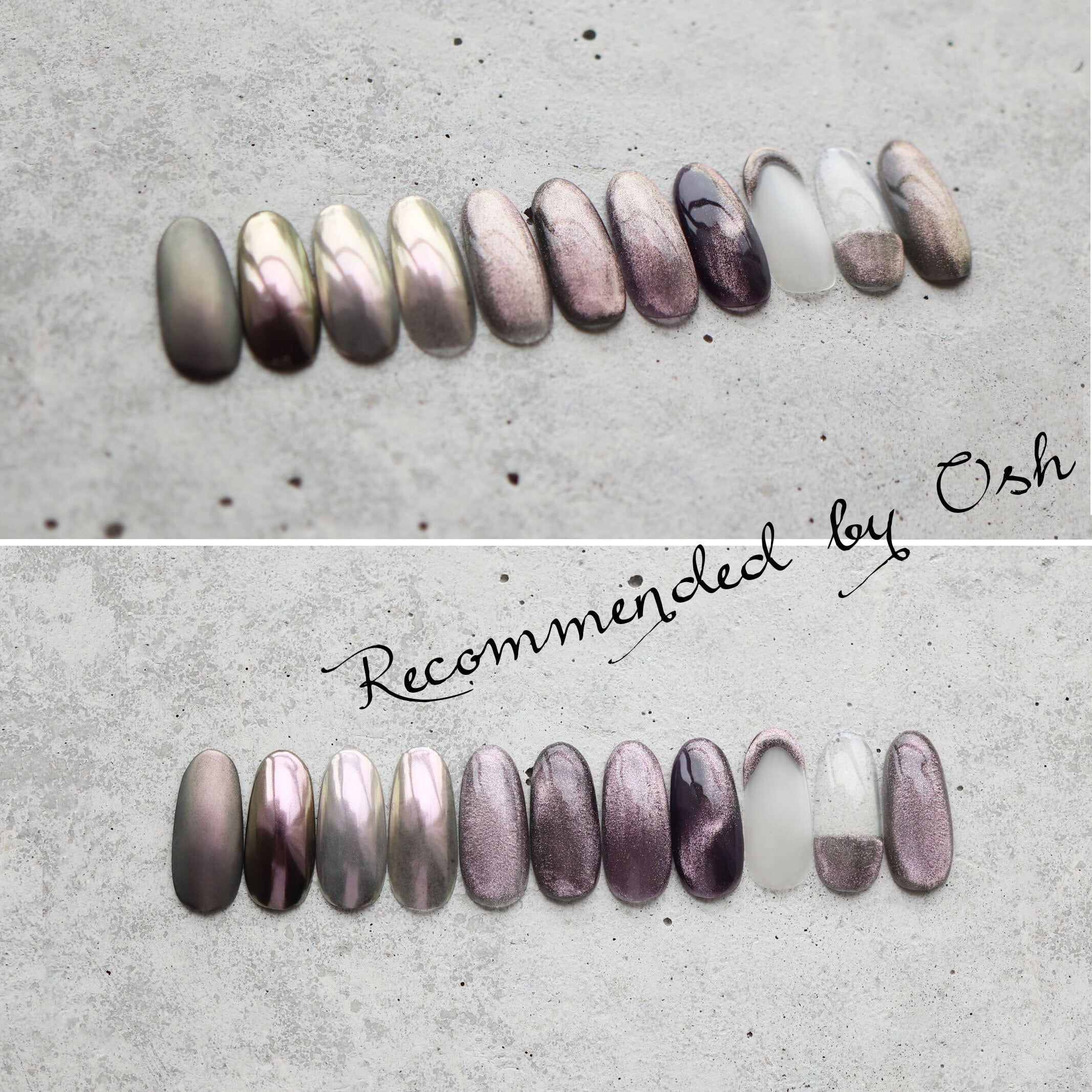 パウダーを混ぜたクリアジェルをお好みのベースカラーに乗せるのはもちろん、お好みのカラージェルに直接混ぜたり、相性やアイデア次第で様々なカラーや輝きでマグネットエフェクトを楽しむ事ができます。
